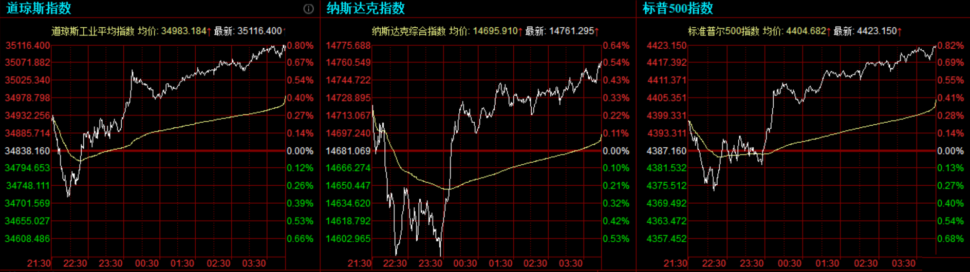 道指收涨278.24点,或0.80%,报35116.40点;纳指涨80.23点,或0.55%,报14761.29点;标普500指数涨35.99点,或0.82%,报4423.15点,创历史新高。