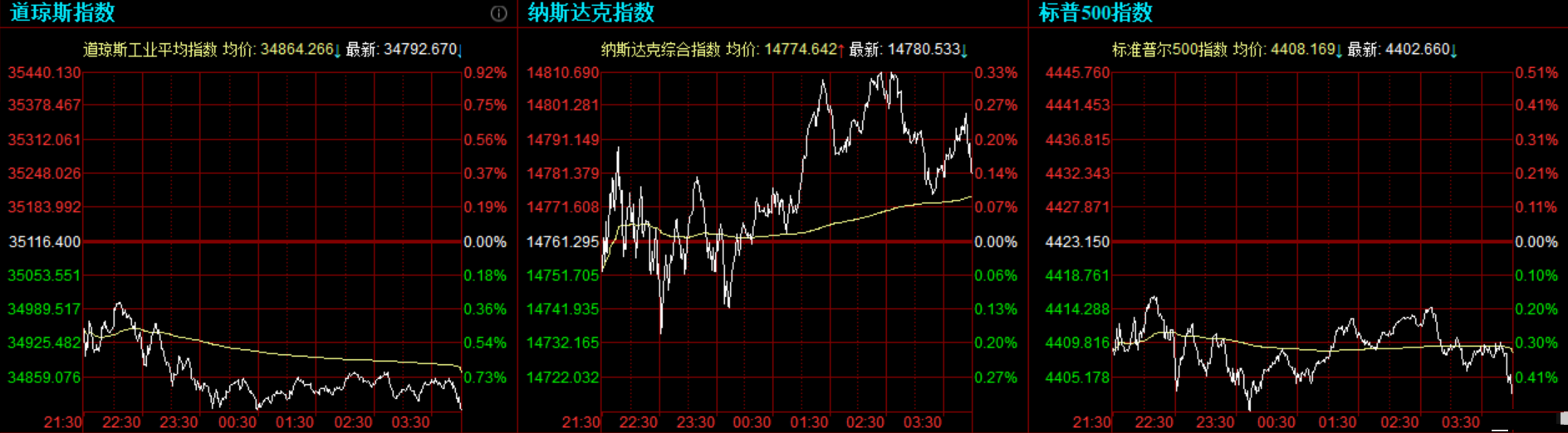 道指收跌323.73点,或0.92%,报34792.67点;纳指涨19.24点,或0.13%,报14780.53点;标普500指数跌20.49点,或0.46%,报4402.66点。