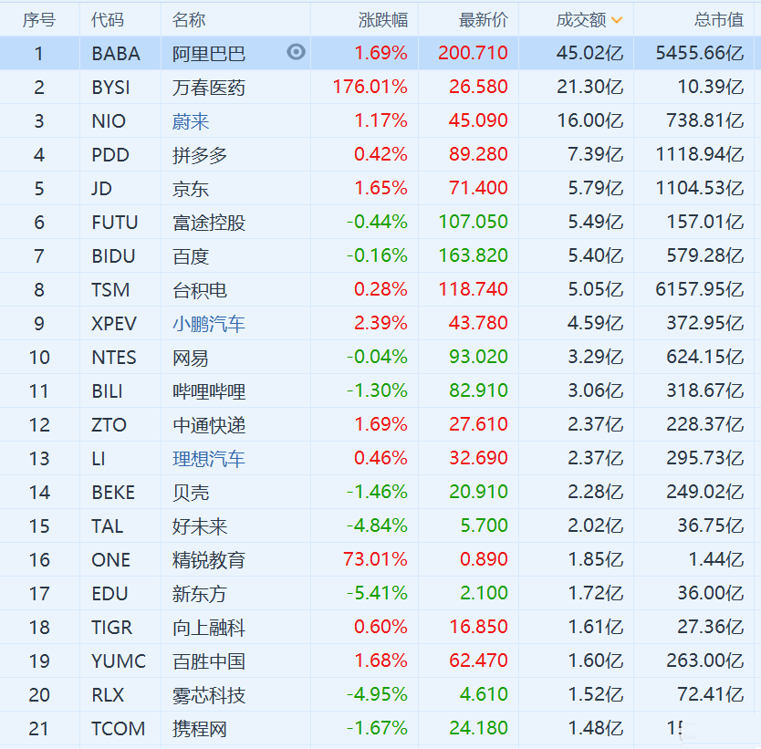 中概教育股涨跌各异,精锐教育暴涨73.01%,高途跌10.78%,新东方跌5.41%,好未来跌4.84%。中概游戏股企稳,跌幅收窄,腾讯ADR涨4.06%,网易跌0.04%,哔哩哔哩跌1.03%。其它热门中概股中,阿里巴巴涨1.68%,京东涨1.65%,爱奇艺涨0.18%,拼多多涨0.42%,百度跌0.16%,滴滴跌3.57%。因新华社发文警惕电子烟流向未成年人,雾芯科技收跌4.95%。