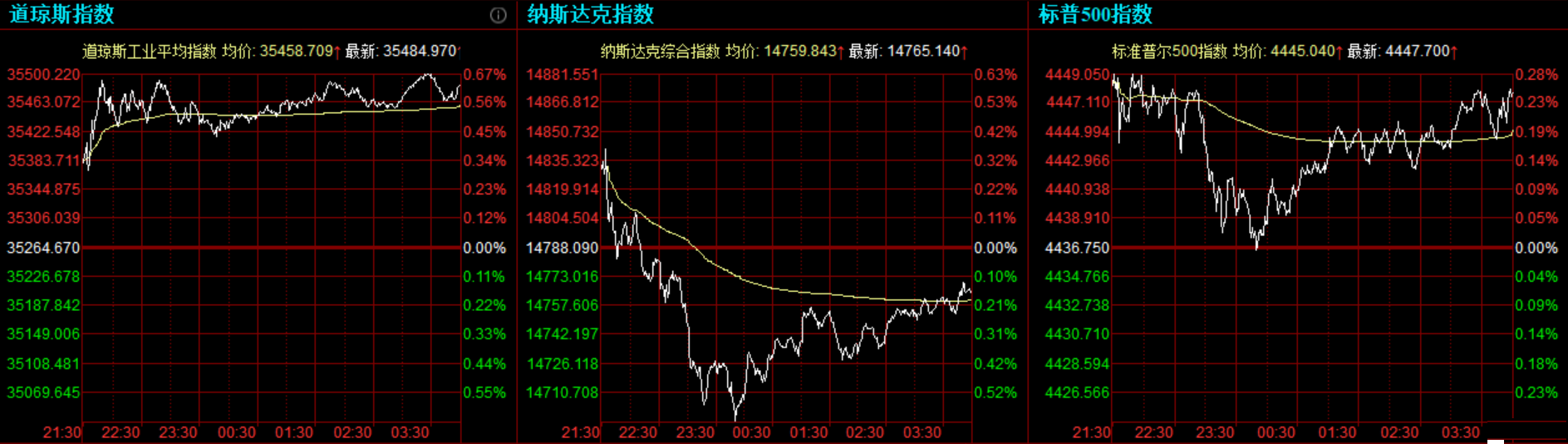 道指收涨220.3点,或0.62%,报35484.97点;纳指跌22.95点,或0.16%,报14765.14点;标普500指数涨10.95点,或0.25%,报4447.7点。道指最高上涨至35501.16点,标普500指数最高上涨至4449.44点,均创盘中历史新高。