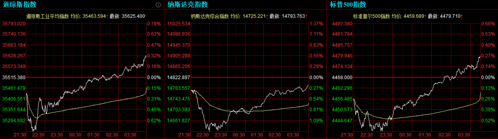 道指收涨110.02点,或0.31%,报35625.4点;纳指跌29.14点,或0.2%,报14793.76点;标普500指数涨11.71点,或0.26%,报4479.71点。道指最高上涨至35631.19点,标普500指数最高上涨至4480.26点,均创盘中历史新高。