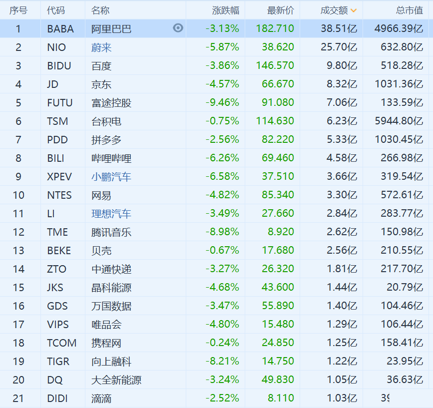 热门中概股颓势明显,京东跌4.57%,阿里巴巴跌3.13%,哔哩哔哩跌6.26%,网易跌4.82%,拼多多跌2.56%,百度跌3.86%,爱奇艺跌5.17%,滴滴跌2.52%,新东方跌4.57%,腾讯音乐跌8.98%,创上市以来收盘新低。