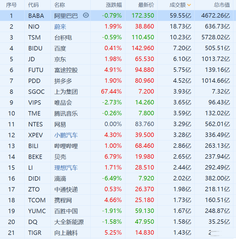 热门中概股涨跌不一,腾讯ADR涨3.72%,阿里巴巴跌0.79%,京东涨1.98%,微博涨3.58%,拼多多涨1.9%,哔哩哔哩涨1%,百度涨0.41%,新东方涨5.41%,网易平收,唯品会跌2.7%,腾讯音乐跌0.26%,爱奇艺跌0.46%,滴滴跌6.49%,涂鸦智能跌19%,携程涨超4.5%,富途控股和老虎证券涨约5%。