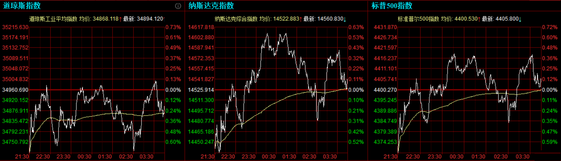 道指收跌66.57点,或0.19%,报34894.12点;纳指涨15.87点,或0.11%,报14541.79点;标普500指数涨5.53点,或0.13%,报4405.8点。