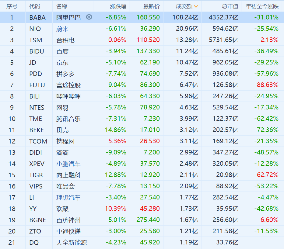 热门中概股普遍大跌,阿里巴巴跌6.85%,京东跌5.1%,微博跌0.85%,拼多多跌7.74%,哔哩哔哩跌6.03%,百度跌3.94%,新东方跌7.18%,网易跌5.78%,腾讯音乐跌7.31%,爱奇艺跌5.86%,滴滴跌9.09%,贝壳跌14.86,天境生物跌15.79%,高途跌15%,老虎证券跌超12%,掌门教育跌超11%。