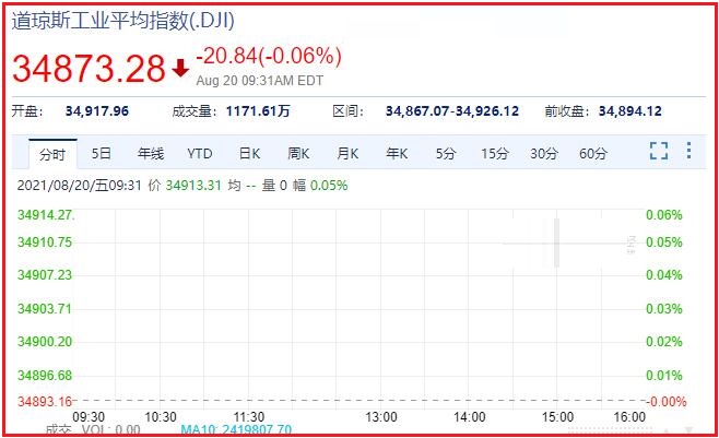 1、截止发稿时间,道琼斯报于34888.31:,成交量:1403.81万
