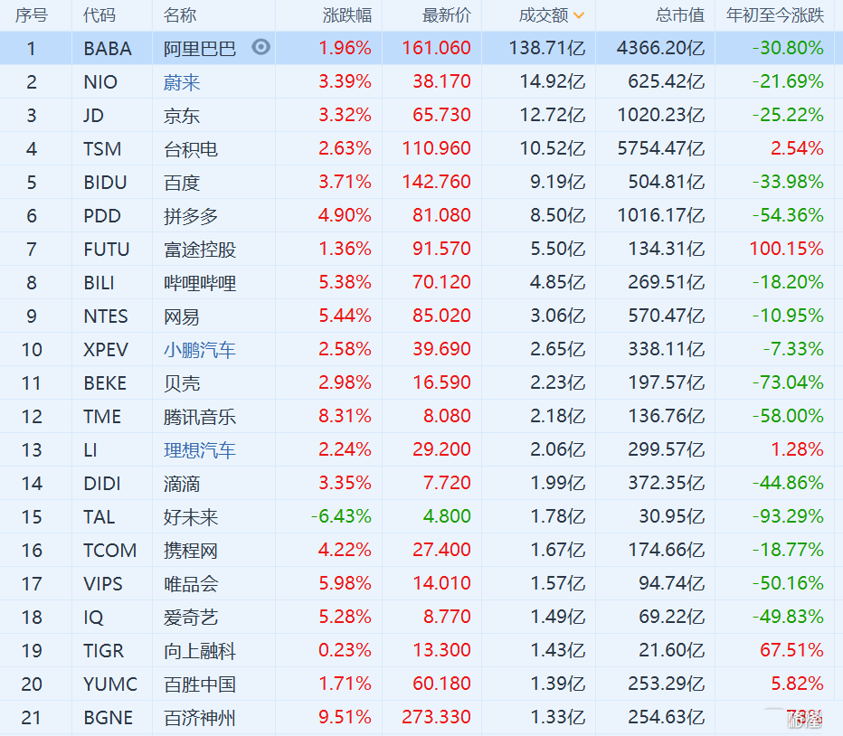 热门中概股集体反弹,阿里巴巴涨1.96%,京东涨3.32%,百度涨3.71%,网易涨5.44%,腾讯ADR涨1.93%,滴滴涨3.35%,腾讯音乐涨超8%,斗鱼涨超7%,B站涨5%,好未来则跌超6%,知乎跌约8%。