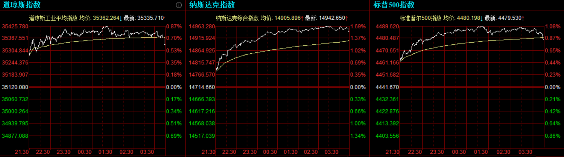 道指收涨215.63点,或0.61%,报35335.71点;纳指涨227.99点,或1.55%,报14942.65点;标普500指数涨37.86点,或0.85%,报4479.53点。周一纳指最高上涨至14963.47点,标普500指数上涨至4489.88点,均创盘中历史新高。