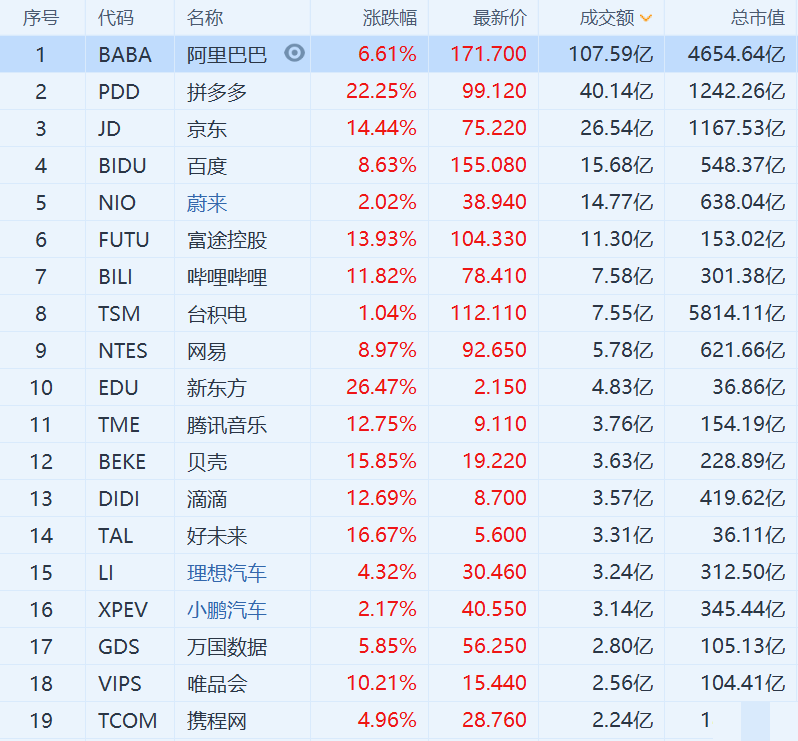 纳斯达克金龙中国指数大涨8%,连续第三天攀升;拼多多涨超22%,京东涨超14%,网易和百度涨超8%,新东方涨超27%,高途教育涨超18%,好未来涨超16%,腾讯音乐涨超12%,阿里巴巴涨逾6%,滴滴涨12.69%,哔哩哔哩涨11.82%,爱奇艺涨8.55%,微博涨6.02%。