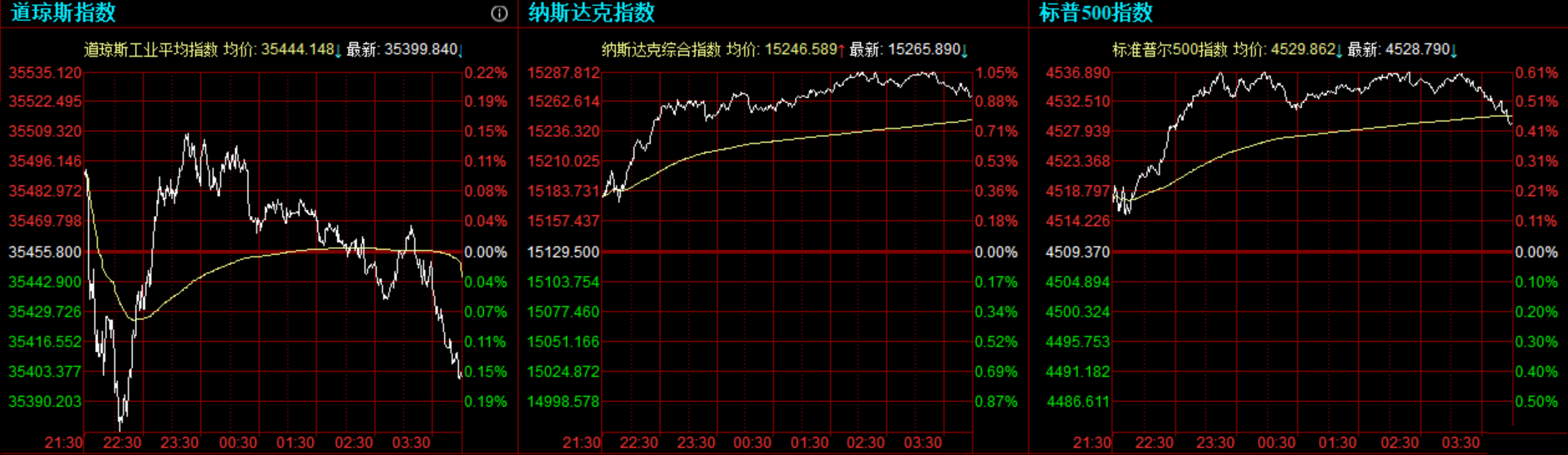道指收跌55.96点,或0.16%,报35399.84点;纳指涨136.39点,或0.9%,报15265.89点;标普500指数涨19.42点,或0.43%,报4528.79点。周一纳指最高上涨至15288.08点,标普500指数上涨至4537.36点,均为历史高位。