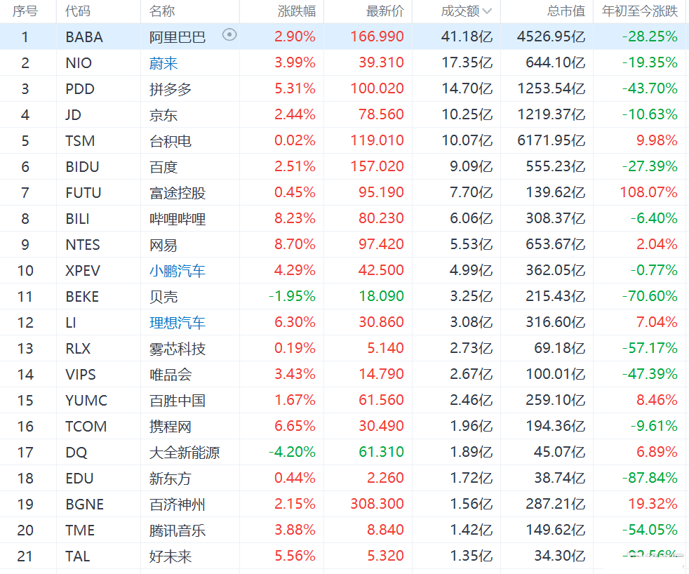 中概股逆市走强,游戏股中,周一跌超3%的网易收涨8.7%,腾讯ADR涨超5%,哔哩哔哩涨超8%;拼多多涨超5%,腾讯音乐涨近3.9%,阿里巴巴涨近3%,百度涨2.51%,金融壹账通涨8.8%;贝壳、陆金所等成为少数下跌的股票。