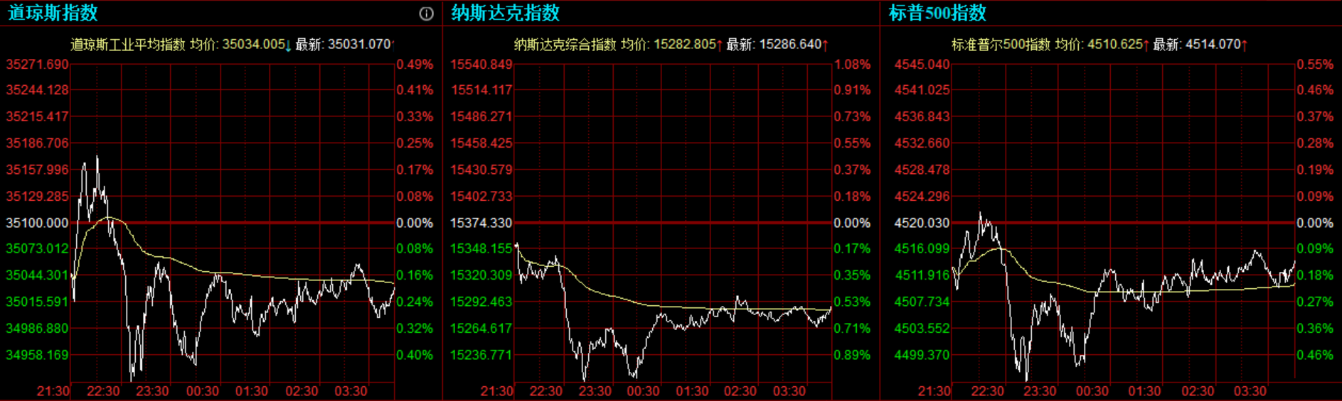道指收跌68.93点,或0.2%,报35031.07点;纳指跌87.69点,或0.57%,报15286.64点;标普500指数跌5.96点,或0.13%,报4514.07点。