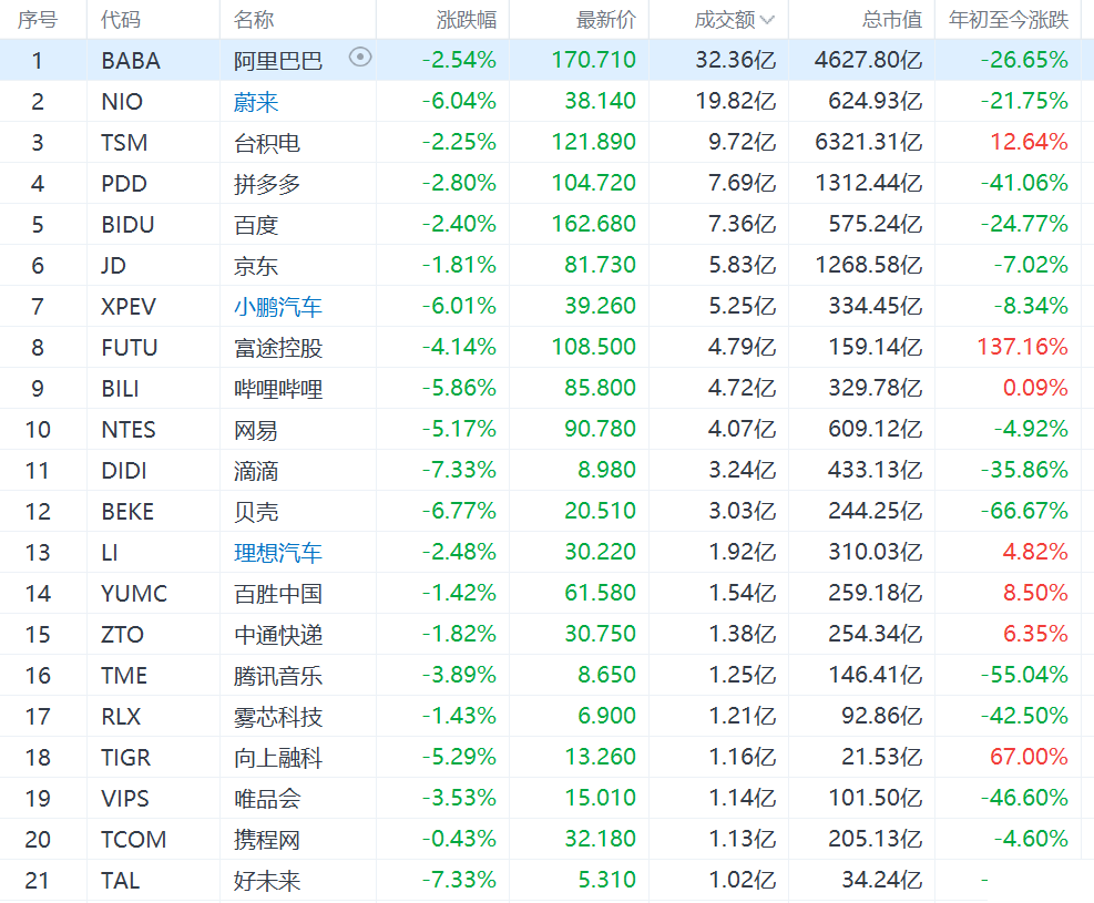 热门中概股集体收跌,教育股跌幅居前。京东跌1.81%,微博跌1.02%,拼多多跌2.8%,哔哩哔哩跌5.86%,百度跌2.4%,新东方%,网易跌5.17%,阿里巴巴跌2.54%,腾讯音乐跌3.89%,爱奇艺跌5.6%,新东方跌6.17%,贝壳跌6.77%,好未来跌7.33%,高途跌近13%,滴滴跌7.33%。