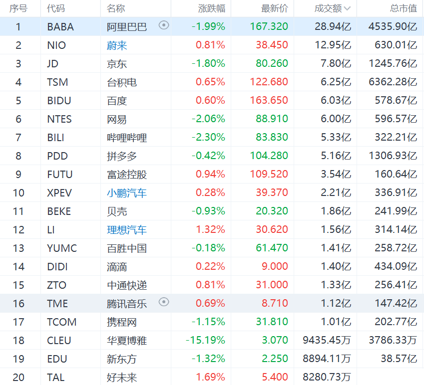热门中概股涨跌不一,京东跌1.8%,拼多多跌0.42%,哔哩哔哩跌2.3%,新东方跌1.32%,网易跌2.06,阿里巴巴跌1.99%,爱奇艺涨1.77%,百度涨0.6%,微博涨0.22%,腾讯音乐涨0.69%,滴滴涨0.22%。