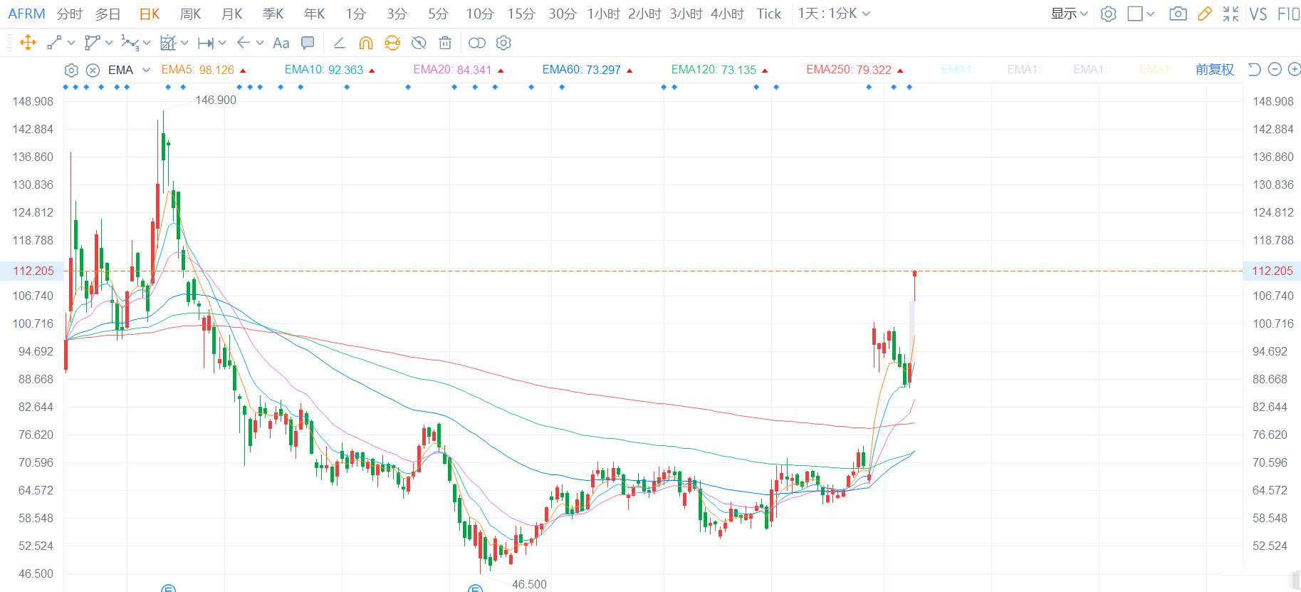 被称为美版“花呗”的金融科技公司Affirm(AFRM.US)一度涨近20%报112.89美元,市值超300亿美元。