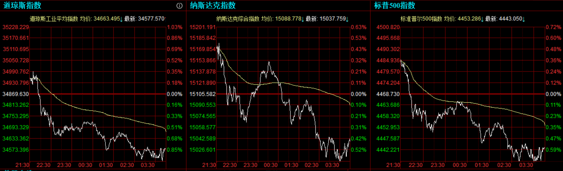 道指收跌292.06点,或0.84%,报34577.57点;纳指跌67.82点,或0.45%,报15037.76点;标普500指数跌25.68点,或0.57%,报4443.05点。