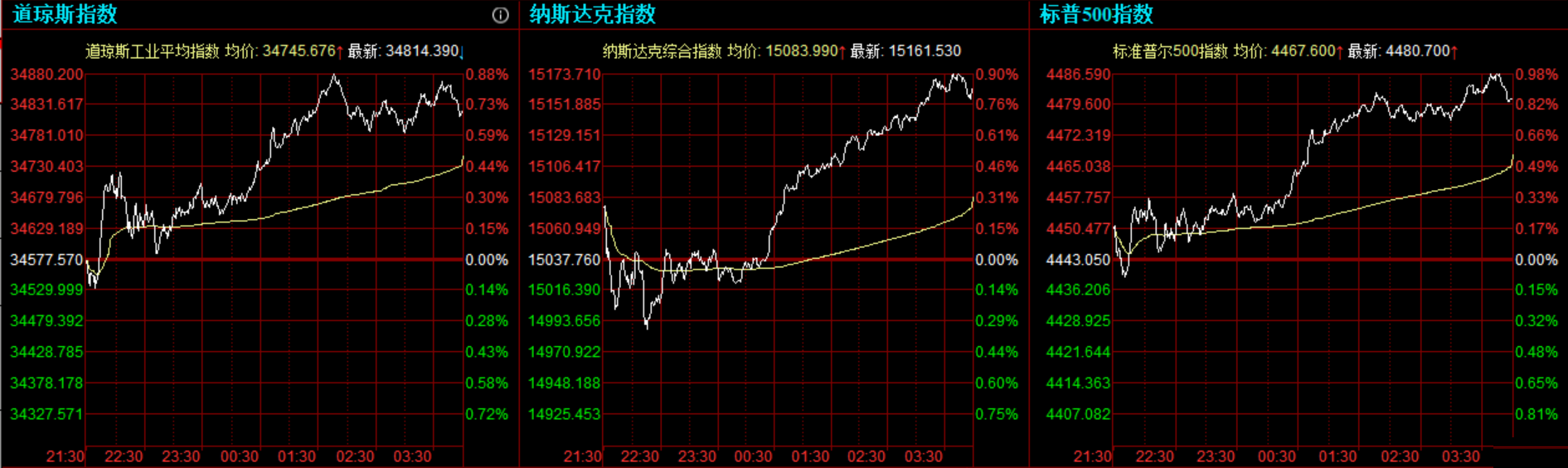 道指收涨236.82点,或0.68%,报34814.39点;纳指涨123.77点,或0.82%,报15161.53点;标普500指数涨37.65点,或0.85%,报4480.7点。