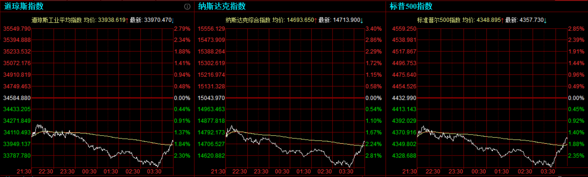 道指收跌614.41点,或1.78%,报33970.47点;纳指跌330.06点,或2.19%,报14713.9点;标普500指数跌75.26点,或1.7%,报4357.73点。周一早间,衡量市场恐慌程度的芝加哥期权交易所波动率指数(VIX)一度上涨超过40%,创5月中旬以来新高。