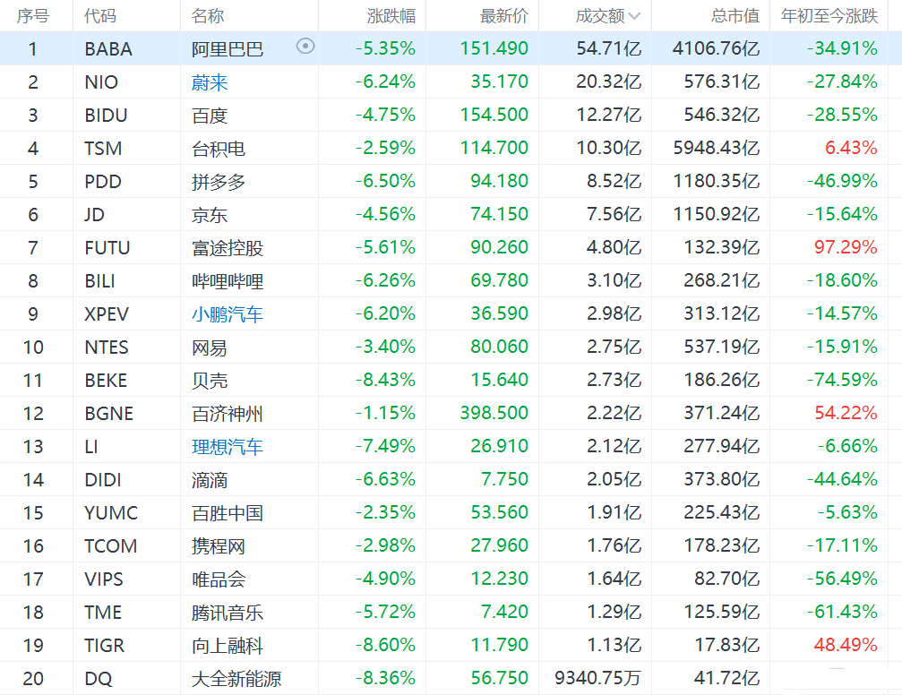 热门中概股追随大盘下挫,阿里巴巴收低5.4%,京东跌4.6%,腾讯ADR跌3.8%,拼多多跌6.5%,百度跌4.8%,网易跌超3%,贝壳找房一度跌超11%,收跌8.4%,恒大ADR跌22.06%较港股仍有16%的溢价。中概新能源汽车股普跌,理想汽车收跌7.5%,此前下调三季度汽车交付量指引,小鹏汽车和蔚来汽车均跌超6%。