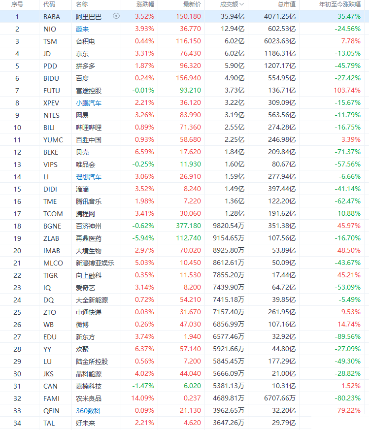 热门中概股集体收涨,京东涨3.31%,微博涨0.26%,拼多多涨1.87%,新东方涨3.74%,网易涨3.26%,阿里巴巴涨3.52%,腾讯音乐涨1.98%,爱奇艺涨3.14%,滴滴涨3.52%,哔哩哔哩涨0.89%,百度涨0.24%。