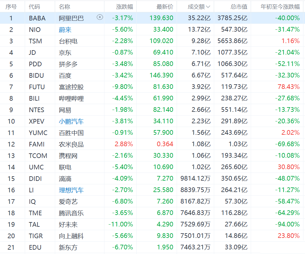热门中概股集体下挫,滴滴跌4.09%,拼多多跌3.48%,阿里巴巴跌3.17%,网易跌1.98%,腾讯ADR跌1.68%,京东跌0.87%,好未来跌超11%。