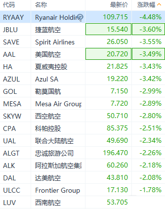 美股航空股普遍,捷蓝航空、美国航空、夏威夷控股跌逾3%。国际航空运输协会预测,全球航空业在2022年将继续亏损,但随着新冠疫情的恢复,预计明年全球航空业的亏损将比今年减少78%,至120亿美元。国际航协估计,2021年全球航空业的亏损为518亿美元,高于4月份预测的477亿美元。