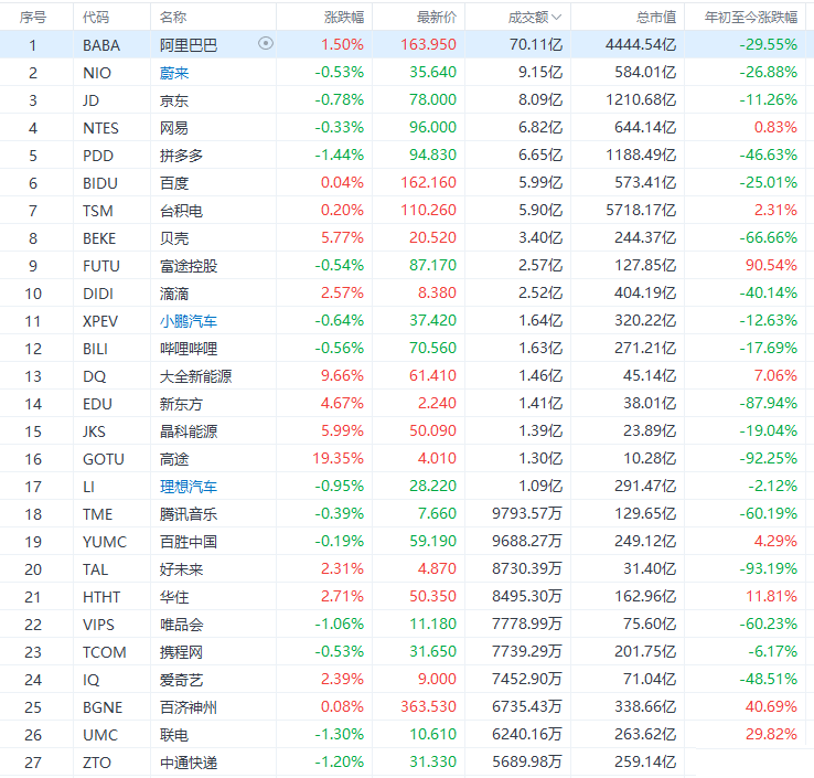 热门中概股涨跌互见,知乎跌超6%,腾讯ADR、拼多多跌超1%,小鹏和理想汽车跌近1%,京东跌近0.8%,蔚来汽车、哔哩哔哩跌逾0.5%,而高途教育涨超19%,新东方涨超5%,瑞幸咖啡粉单涨超3%,爱奇艺、好未来涨超2%,阿里巴巴涨超1%,百度大致收平。