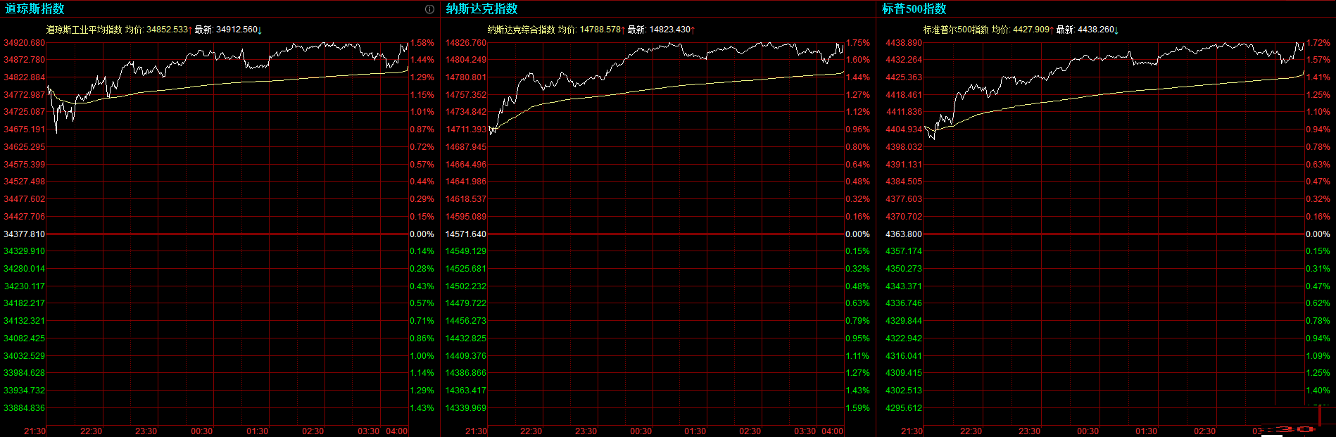 道指收涨534.75点,或1.56%,报34912.56点;纳指涨251.79点,或1.73%,报14823.43点;标普500指数涨74.46点,或1.71%,报4438.26点。