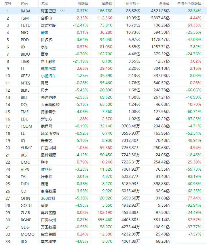 中概股重新回到调整状态,多数明星股收跌,遭央媒质疑信息安全风险的富途控股跌12.41%、向上融科(老虎证券)跌21.19%。爱奇艺跌超5%,雾芯科技跌超4%,拼多多跌超3%,哔哩哔哩、好未来跌超2%,小鹏汽车跌超1%,腾讯ADR跌约1%,百度跌0.7%,阿里巴巴跌约0.4%,而理想汽车涨超2%,新东方涨逾0.8%,京东涨近0.6%,蔚来汽车涨逾0.1%。