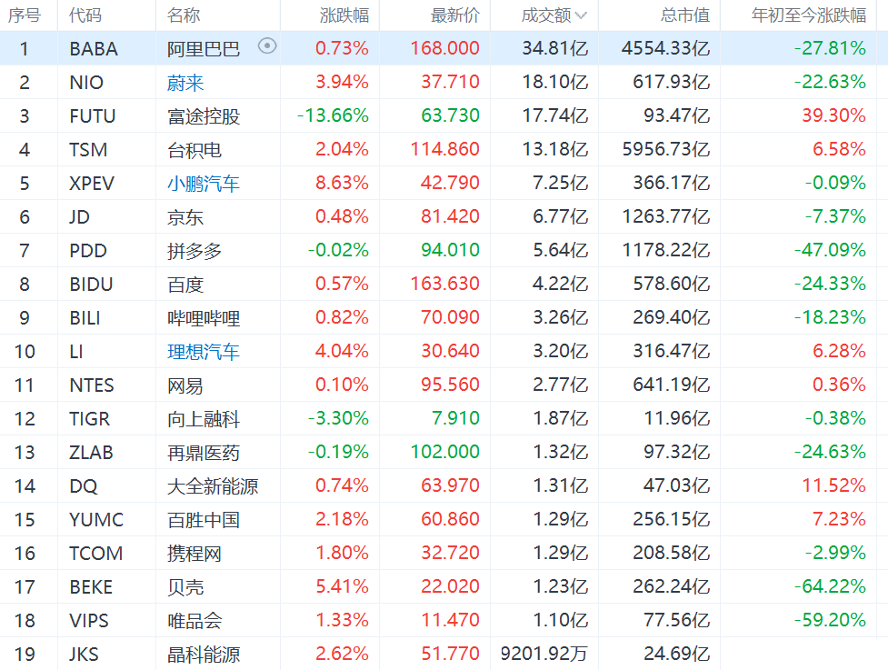 热门中概股多数上涨,小鹏汽车涨超8%,雾芯科技涨超6%,贝壳涨超5%,瑞幸咖啡粉单涨超4%,理想汽车涨4%,蔚来汽车涨超3%,腾讯ADR涨1.8%,哔哩哔哩涨逾0.8%,阿里巴巴和京东涨约0.5%、爱奇艺跌超3%,网易有道跌超2%;中概券商股延续跌势,富途控股跌近14%,老虎证券跌超3%。
