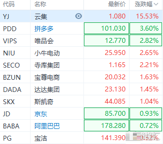 双十一预售活动今晚开启,双十一概念股普遍上涨,云集涨15.5%、拼多多涨3.6%,唯品会、小牛电动涨超超2%,京东涨近1%、阿里巴巴涨0.7%。