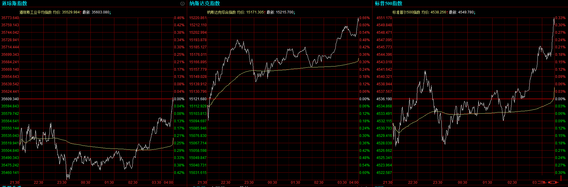 道指跌6.26点,或0.02%,报35603.08点;纳指涨94.02点,或0.62%,报15215.7点;标普500指数涨13.59点,或0.3%,报4549.78点。周四尾盘,标普500指数最高上涨至4551.44点,创盘中历史高位。