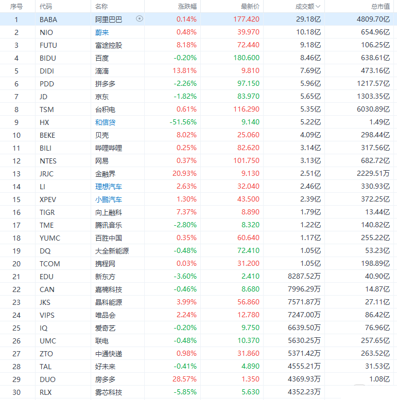 热门中概股涨跌各异,京东跌1.82%,微博跌0.31%,拼多多跌2.26%,哔哩哔哩涨0.25%,百度跌0.2%,新东方跌3.6%,网易涨0.37%,阿里巴巴涨0.14%,腾讯音乐%,爱奇艺跌0.2%,滴滴涨13.81%,趣头条涨26.47%,富途证券涨超8%,老虎证券涨超7%。