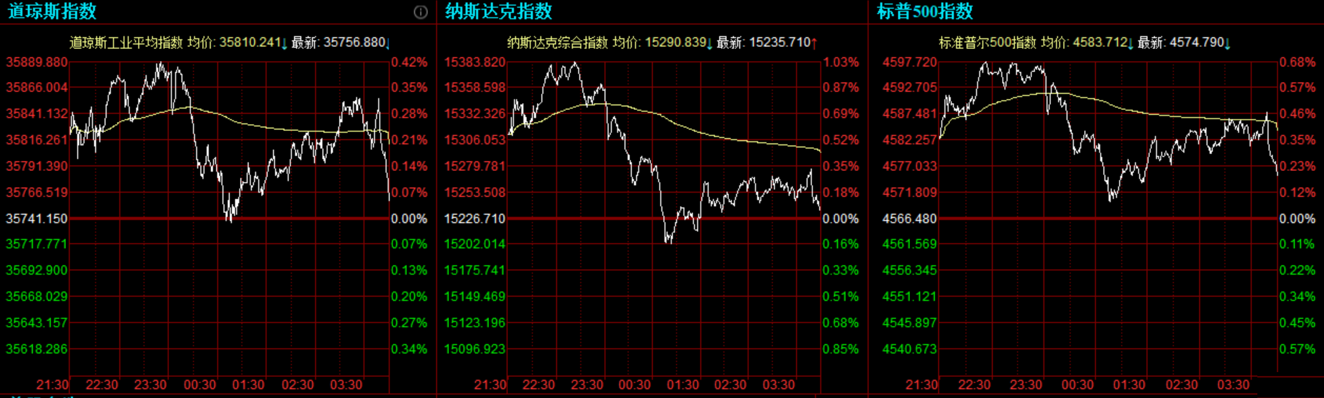 美股收盘三大股指小幅收涨,投资者聚焦美国大型科技股的财报与美国经济数据。道指和标普500指数双双走出三连阳,再创收盘新高。道指涨0.04%,报35756.88点;标普500指数涨0.18%,报4574.79点;纳指涨0.06%,报15235.7点。