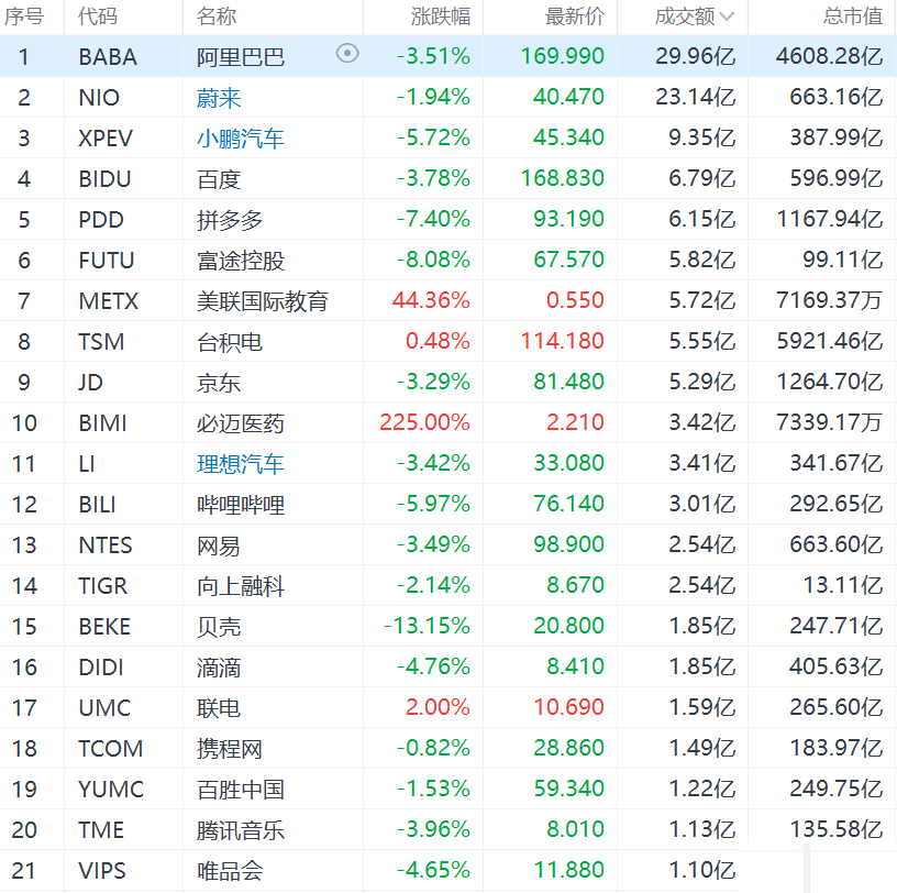 中概股普遍下跌,纳斯达克金龙指数跌4.16%,收于11147点。百度跌3.78%,阿里巴巴跌3.51%,网易跌3.49%,腾讯ADR跌3.47%,京东跌3.29%。滴滴跌4.76%,哔哩哔哩跌5.97%,爱奇艺跌6.26%;中概教育股普跌,好未来跌4.95%,高途跌5.12%,新东方跌5.6%。