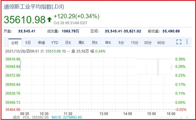 1、截止发稿时间,道琼斯报于:35621.03,成交量:1367.78万