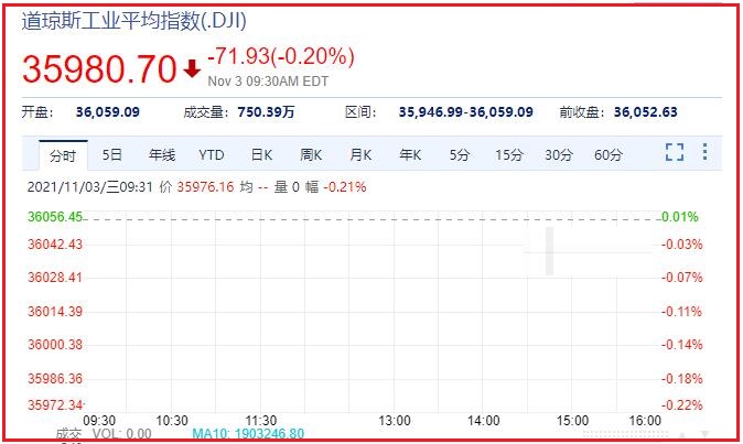 1、截止发稿时间,道琼斯报于:35980.75,成交量:1230.34万