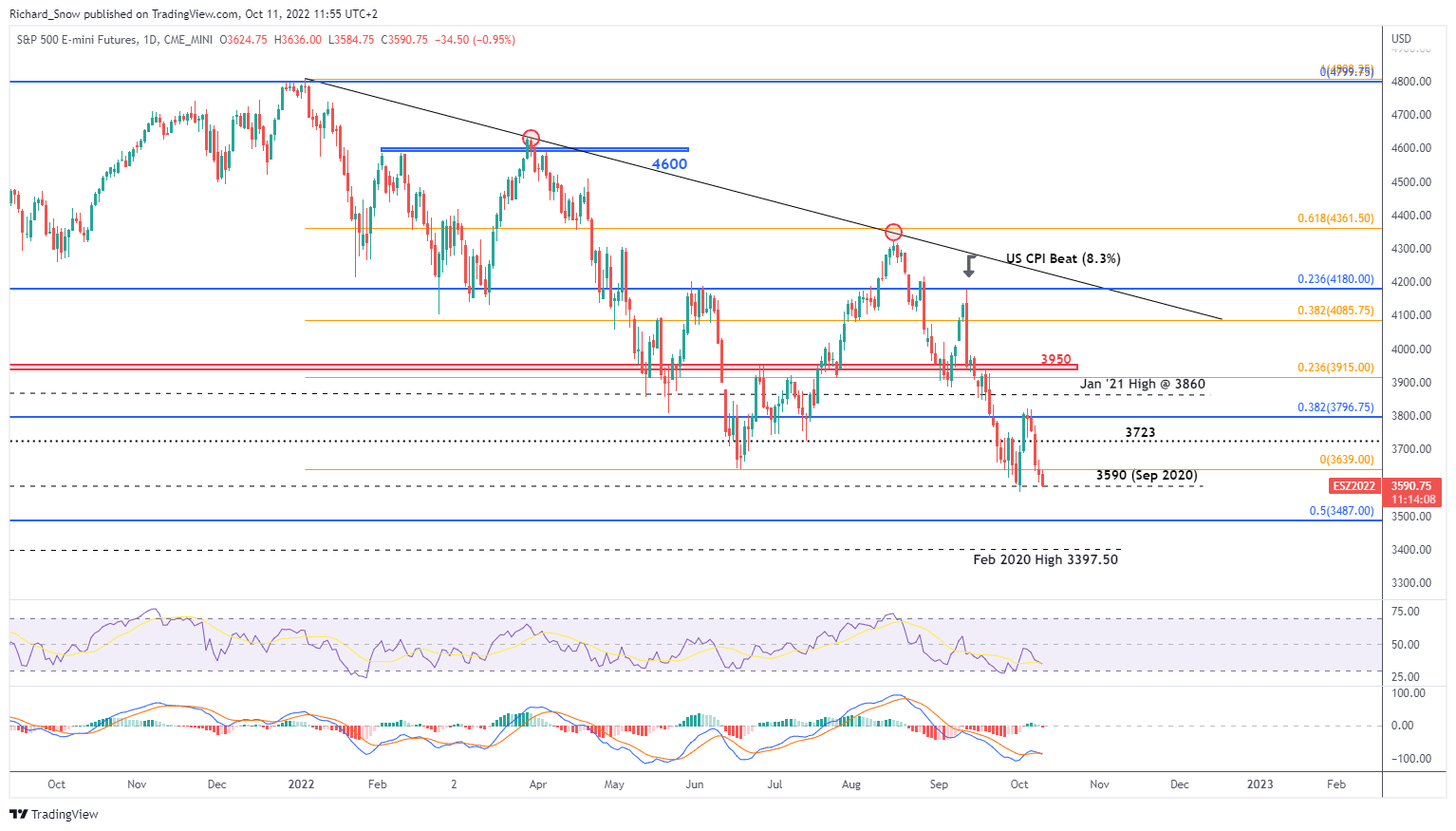 日线图显示标普500指数与创下年度新低有多接近。低点出现在2020年9月的3590点附近,这阻碍了本月初的进一步抛售。有趣的是,美国10年期国债收益率已从4.02%的大关价回落,这可能会为股市提供短期缓解,因为美元在过去几周几乎同步后出现。突破年度低点,有可能在2020-2021年主要走势3487处回撤50%,2020年2月高点3397.50是下一个明显的支撑位。然而,值得一提的是,市场继续对数据保持高度反应,特别是将于周四公布的CPI数据。较高的印刷品预示着趋势的延续,而较低的数字可能会提供暂时的喘息机会。阻力位出现在6月的低点3639,之后为3723和3796。