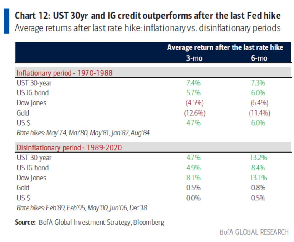 如附图所示,道指在最后一次加息之后的三个月中下跌了4.5%,六个月内下跌了6.4%。不过,30年期国债和投资级债券在两个时期都有不错的表现。