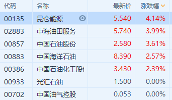 石油股普涨,昆仑能源(0135.HK)涨超4%领涨,中海油服(2883.HK)、中石油涨超3%,中海油、中石化涨超2%。因飓风导致美国产量下降,以及美国上周原油库存意外大幅下降。WTI原油期货主力合约结算价上涨1.88美元,涨幅4.89%,报40.16美元/桶。布伦特原油期货结算价上涨1.69美元,涨幅4.17%,报42.22美元/桶。此外,EIA近日上调2020年国际油价预测称,预计2020年WTI原油价格为38.99美元/桶,此前预计为38.50美元/桶;预计2020年布伦特原油价格为41.90美元/桶,此前预计为41.42美元/桶。