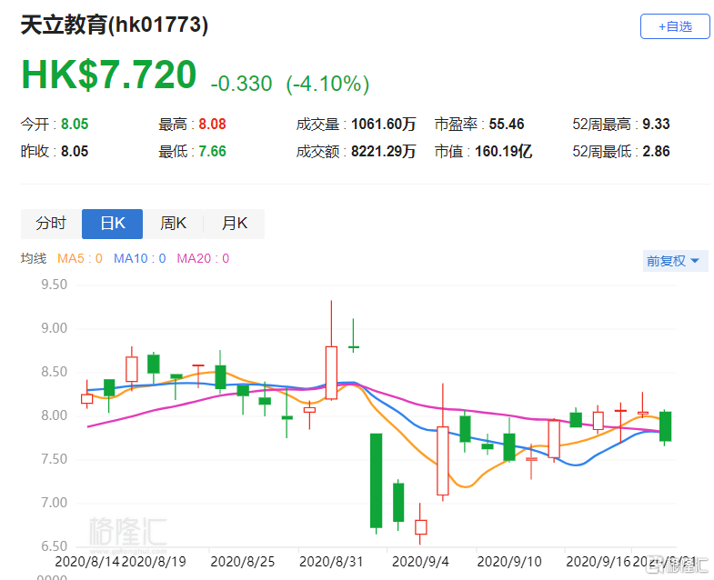港股实时行情:天立教育(1773.HK)跌逾4% 遭非执行董事田亩减持204.4万股
