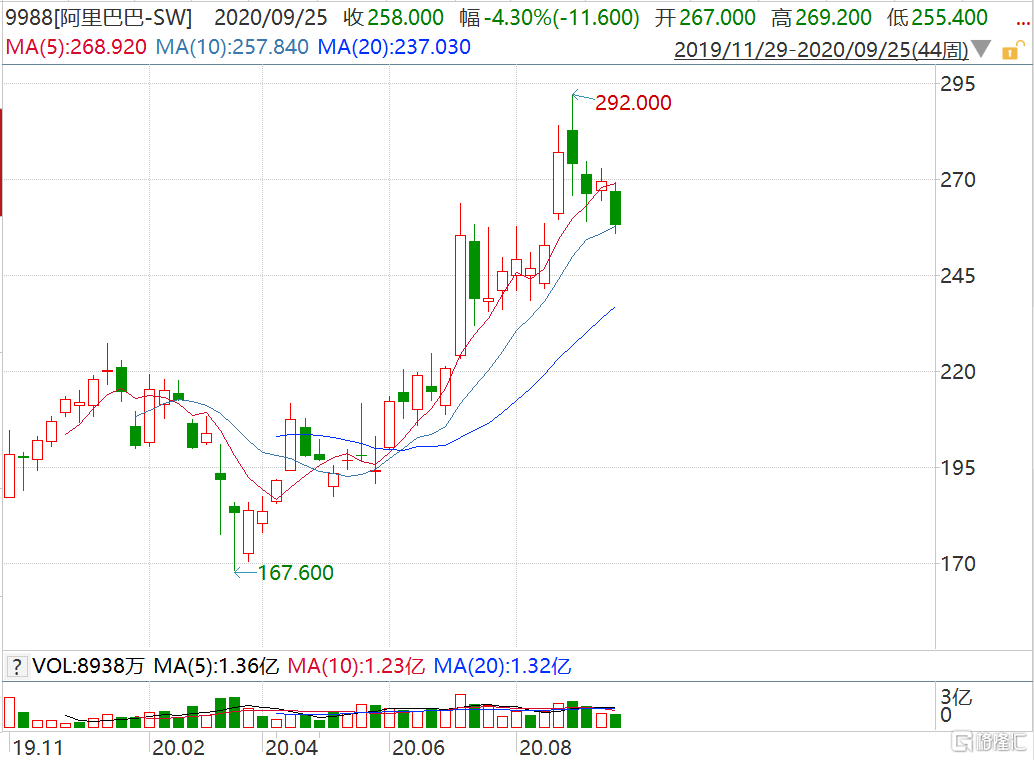 自2021财年第一季度财报公布后,资本市场普遍看好阿里巴巴发展前景,特别是其持续创新能力。自今年年初全球股市触底后,阿里巴巴开启了一轮快速增长。麻省理工大学的工程师和华尔街分析师组成的研究小组Trefis在《福布斯》发表文章称,“自今年3月的低点以来,阿里巴巴股价已增长近70%。我们认为,阿里巴巴股价还有巨大上涨空间。”阿里巴巴港股走势(周线)