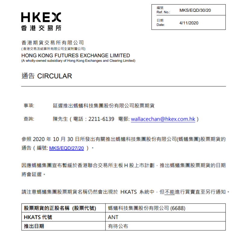 港交所:推出蚂蚁集团股票期货的日期将会延迟
