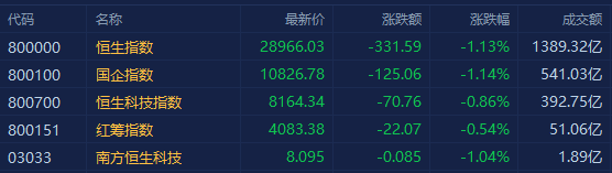 港股三大指数午后跌幅均扩大至超1%,全天呈现单边下跌行情。截至收盘,恒指跌1.13%报28966点,国指跌1.14%报10826点,恒生科技指数跌0.86%报8164点。盘面上,教育股集体下挫,新东方在线大跌近9%,物管股、汽车股、半导体股、家电股、银行股、区块链等多数板块下跌,恒大汽车、长城汽车均跌逾3%;大型科技股走弱明显,百度、快手跌近3%,阿里、腾讯、美团皆跌超1%,惟小米逆势涨超2%;5G概念股在弱市中崛起明显,京信通信大涨逾8%,中兴通讯涨超4%;钢铁、煤炭等周期板块普涨。今日大市成交额缩量至1389亿港元,南下资金逆势净流入17.4亿港元。