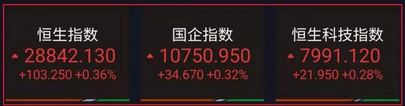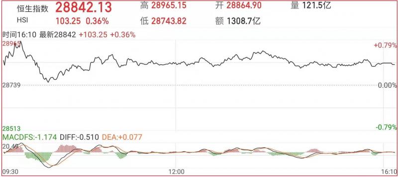 1.上周五经过周内连续多天反覆后,由于恒指并未有进一步跌穿7日之低位28615点,故单从走势上看,大市该只属反覆欲试底之弱态而已,并非继续寻底之格局。港股开盘后小幅震荡,截至收盘,恒生指数涨0.36%,报28842.13点;国企指数涨0.32%,红筹指数涨0.19%;