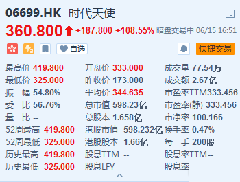 据富途证券,时代天使(6699.HK)暗盘段现报360.8港元,较发行价173港元暴涨108.55%。