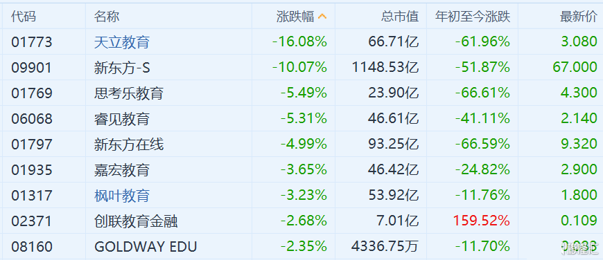 港股教育股跌幅进一步扩大,天立教育盘中一度跌近20%,新东方-S跌超10%,思考乐和睿见教育跌超5%,新东方在线跌近5%。