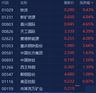 港股钢铁股全线上扬,铁货大涨超9%,天工国际涨超4%,重庆钢铁、鞍钢股份等均上涨。发改委表示,预计未来一段时期,特别是在十四五结束前,国内对于粗钢的需求还会有一定上升的空间,将严格执行禁止新增产能的规定,推动钢铁行业绿色低碳发展,促进钢铁行业兼并重组,坚持企业主体,政府引导,市场化运作的原则,鼓励钢铁行业优化布局,提升钢铁行业发展质量和水平。