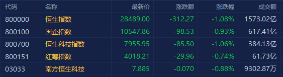 港股三大指数全线收跌,市场整体情绪表现低迷。截至收盘,恒指跌1.08%报28489点,国指跌0.93%报10547点,恒生科技指数跌1.06%报7955点。盘面上,餐饮板块继续大跌,海底捞再度跌至2000亿港元下方;香港银行股、家电股、港口航运股、石油股、半导体股、乳制品股普遍走低,恒生银行、汇丰银行均跌超3%;大型科技股多数下挫,小米、网易跌近3%,京东、腾讯跌2%;另一方面,因中国电信调整派息,股价大涨带动整个电信板块走俏,钢铁板块午后涨幅有所收窄,军工股全天表现强势。