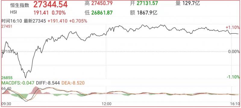 1.上周五恒指今早先轻微低开22点至27131点,其后曾略作后抽至27265点。惟买盘不继,加上沽压又再涌现,故整个大市卒掉头回落,恒指已一度再急回292点至26861点。截至收盘,恒生指数涨0.7%,报27344.54点;国企指数涨0.64%;红筹指数跌0.08%。恒生科技指数(7429.49 107.51 1.47%)本周收跌近6%,创3月来最大周跌幅;